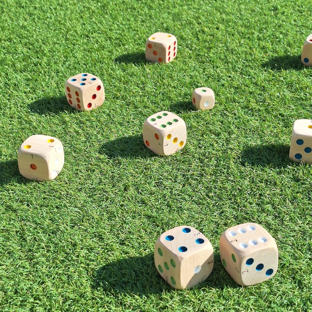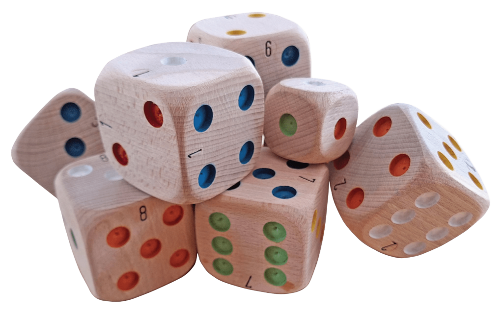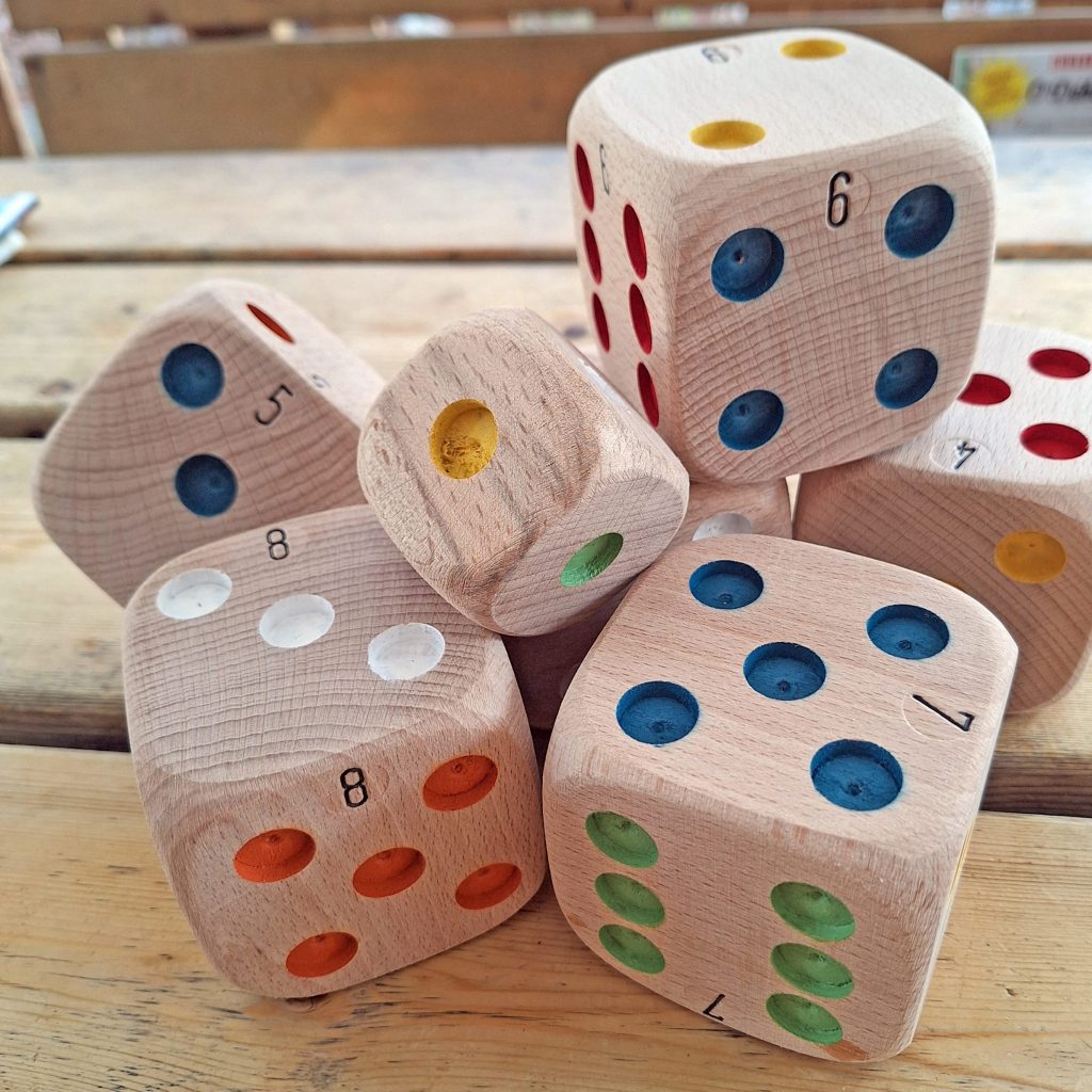 Des dés de la taille d’une boule de pétanque (75 mm de côté) et trois fois plus légers. Sympa pour les plus jeunes !