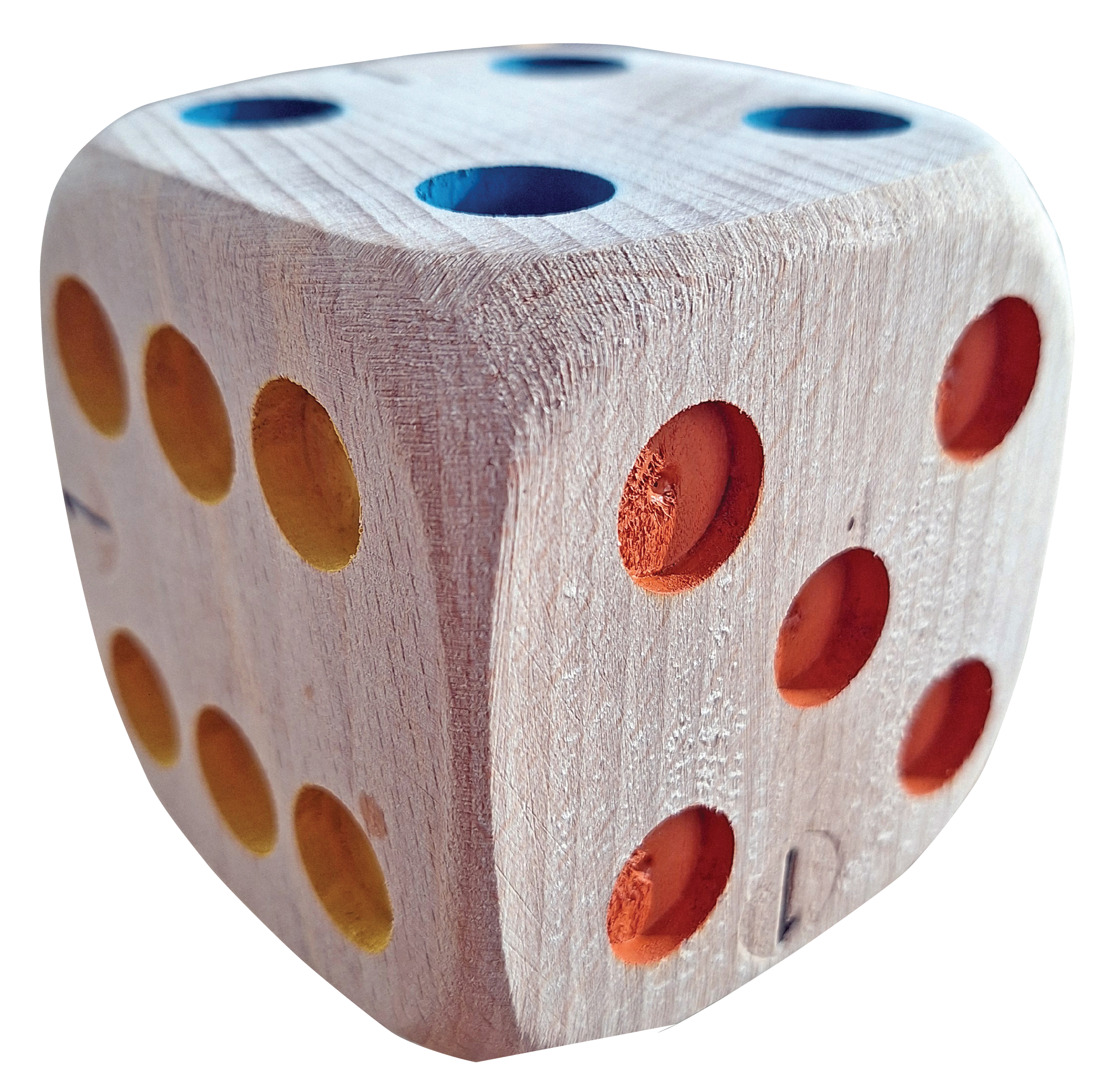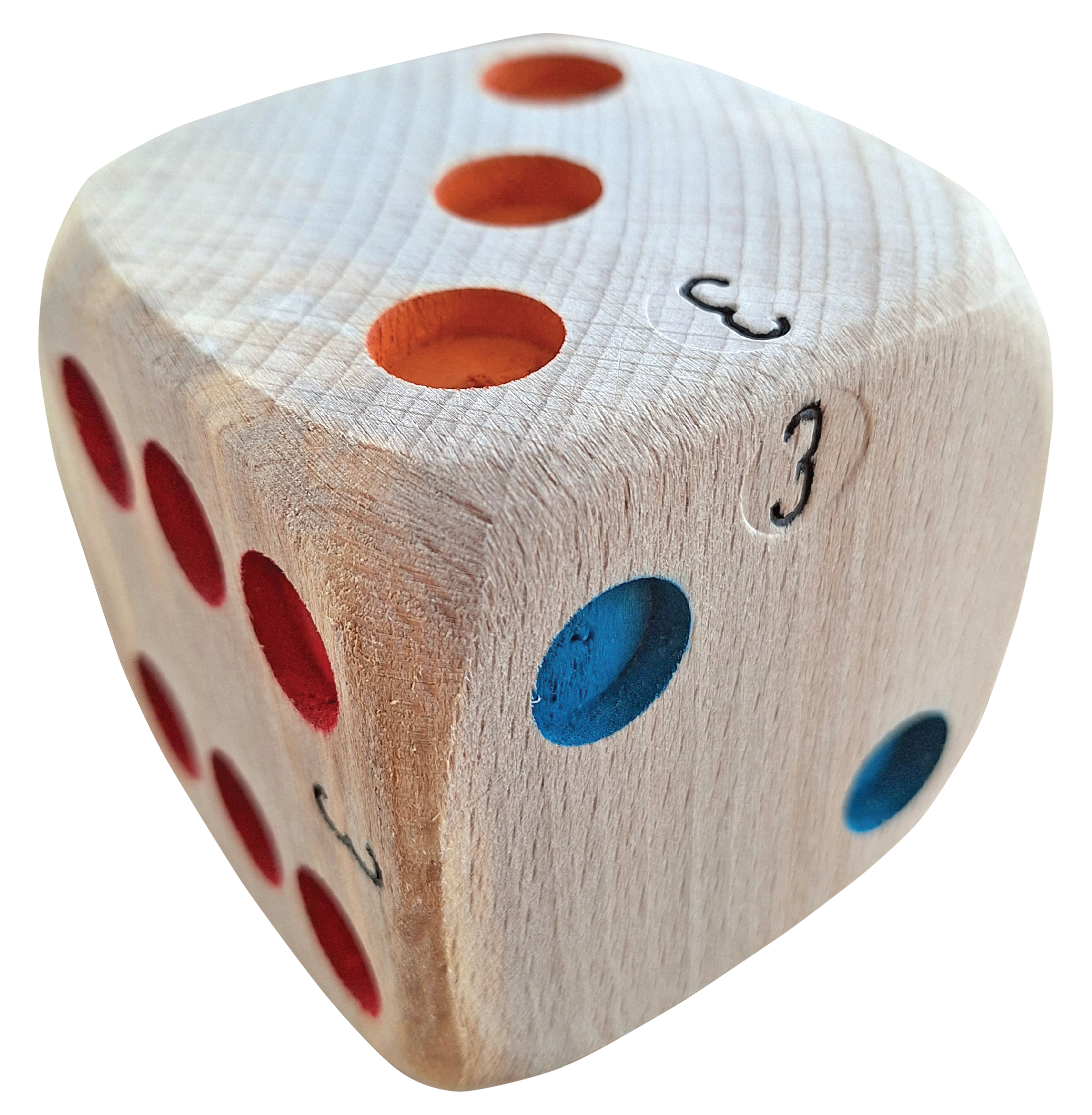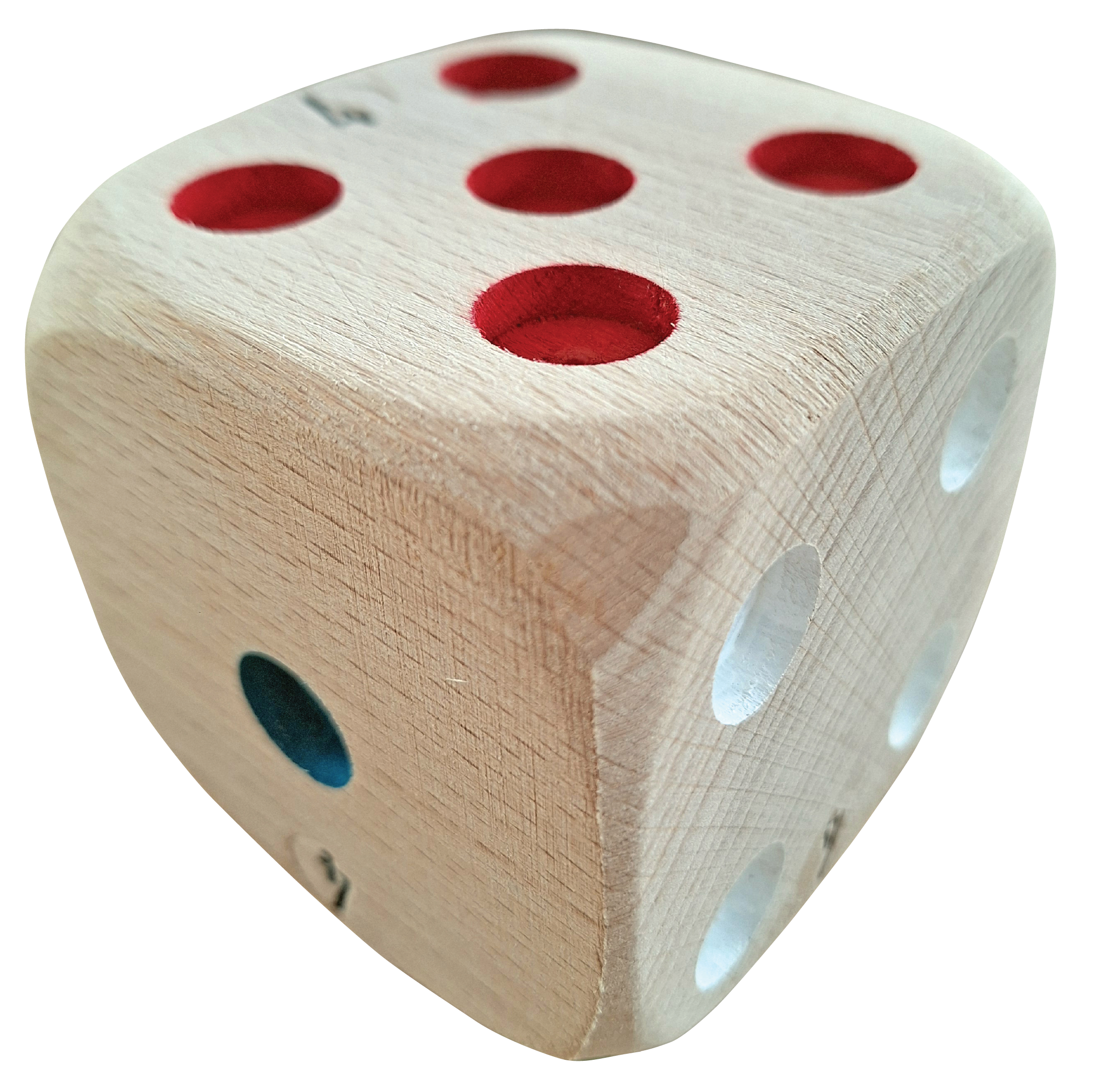 Des dés de la taille d’une boule de pétanque (75 mm de côté) et trois fois plus légers. Sympa pour les plus jeunes !