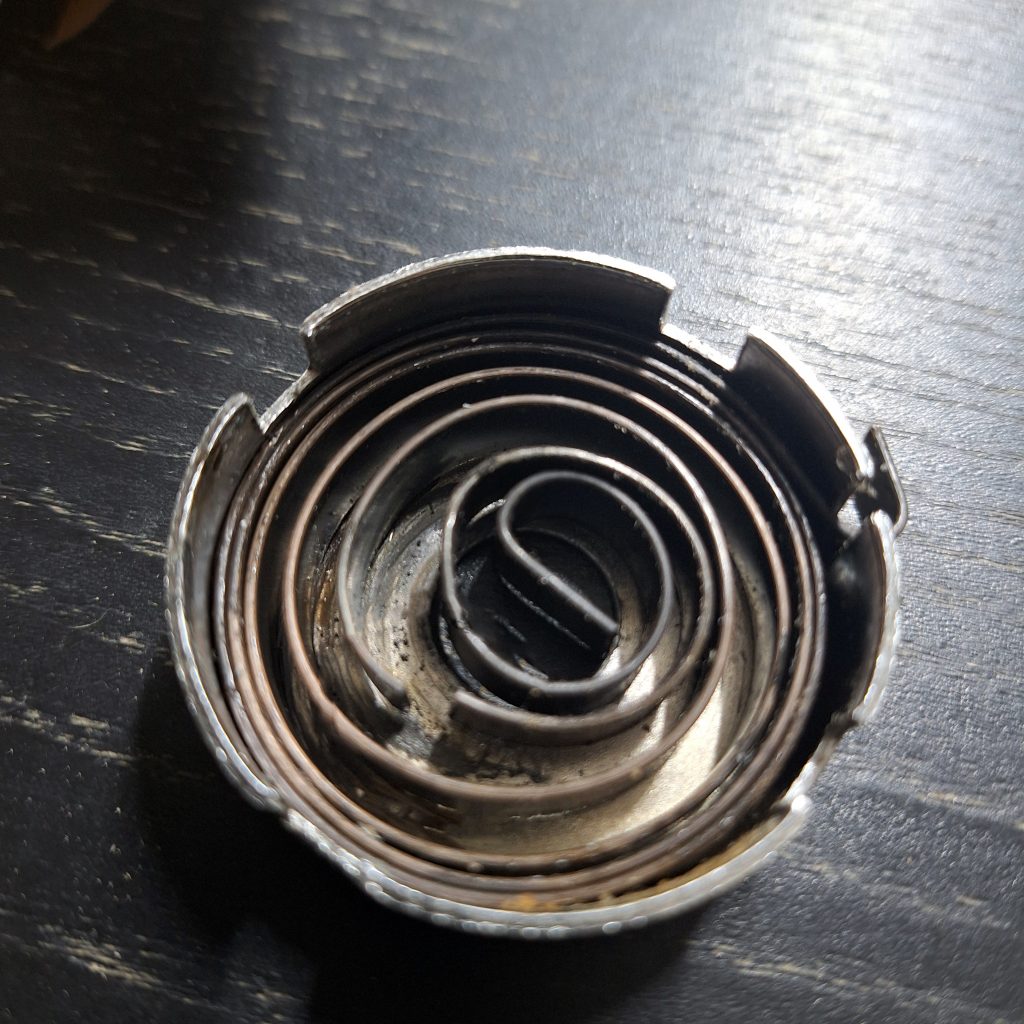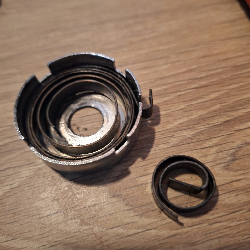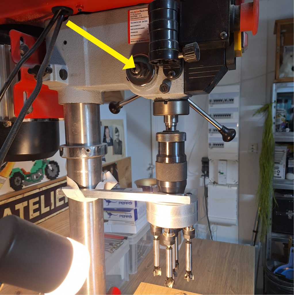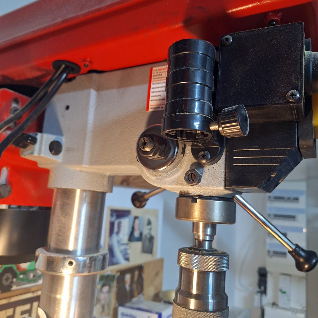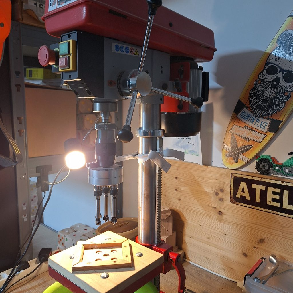 Le tendon d’Achille de ma perceuse colonne ? C’est le ressort spirale de remontée automatique du mandrin. Il faut admettre que le matos est sacrément sollicité quand la machine est en phase « perçage de trous » dans les dés.