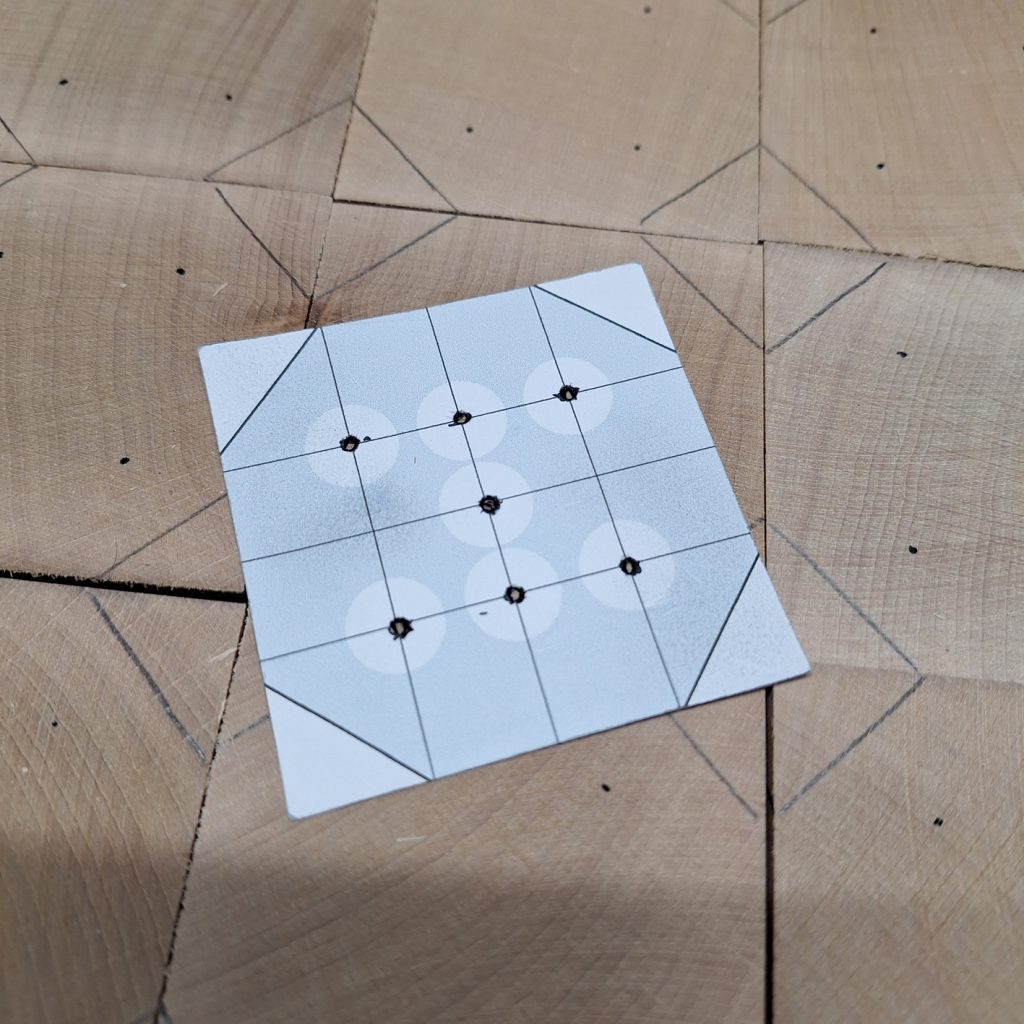 De la même manière qu’avant la création de la « décoinneuse », les angles du dé étaient marqués (photo 03) avant découpage à la scie à ruban. Deux gabarits en contreplaqué ont été fabriqués (photos 4 et 5), un pour le dé et un pour le déboulet.
