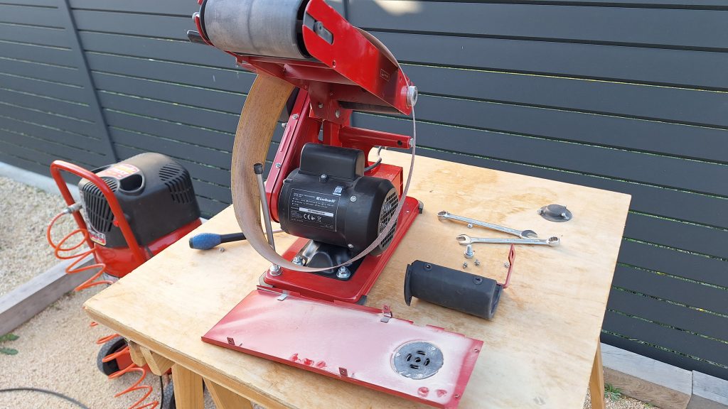 Côté ponçage, la petite ponçeuse à bande du début (photo 06) a rapidement abdiqué. Elle a fait place à une machine plus performante mieux adaptée au volume de travail à réaliser.