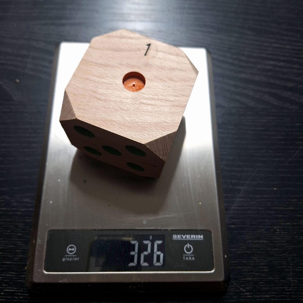 A la base, les dés affichent déjà des variations de poids liées à la densité du bois de hêtre et à son taux d’humidité.