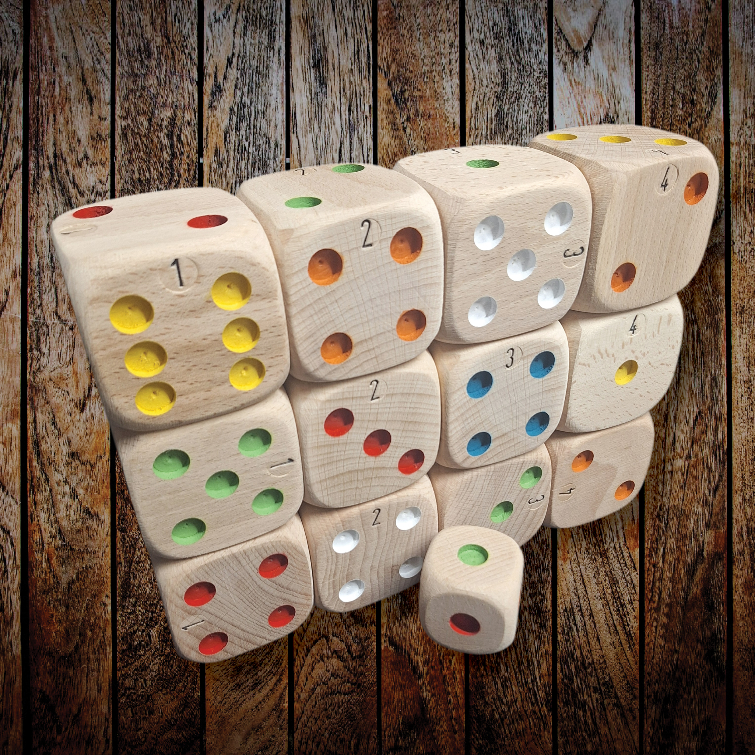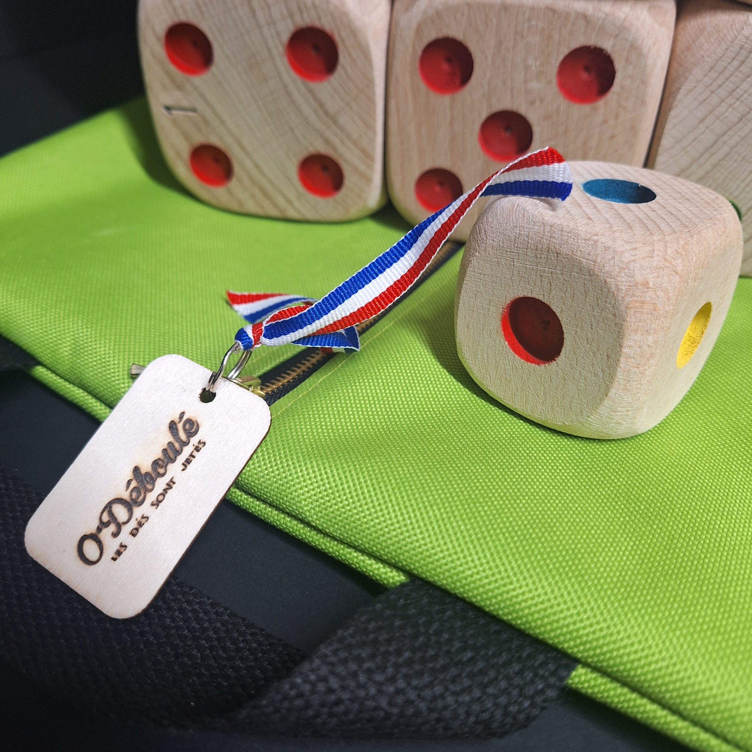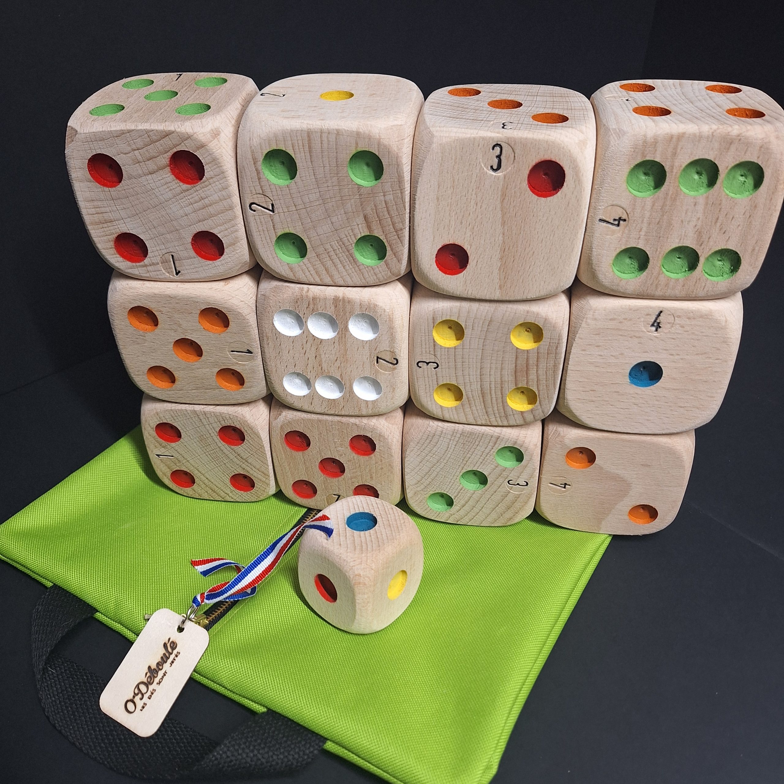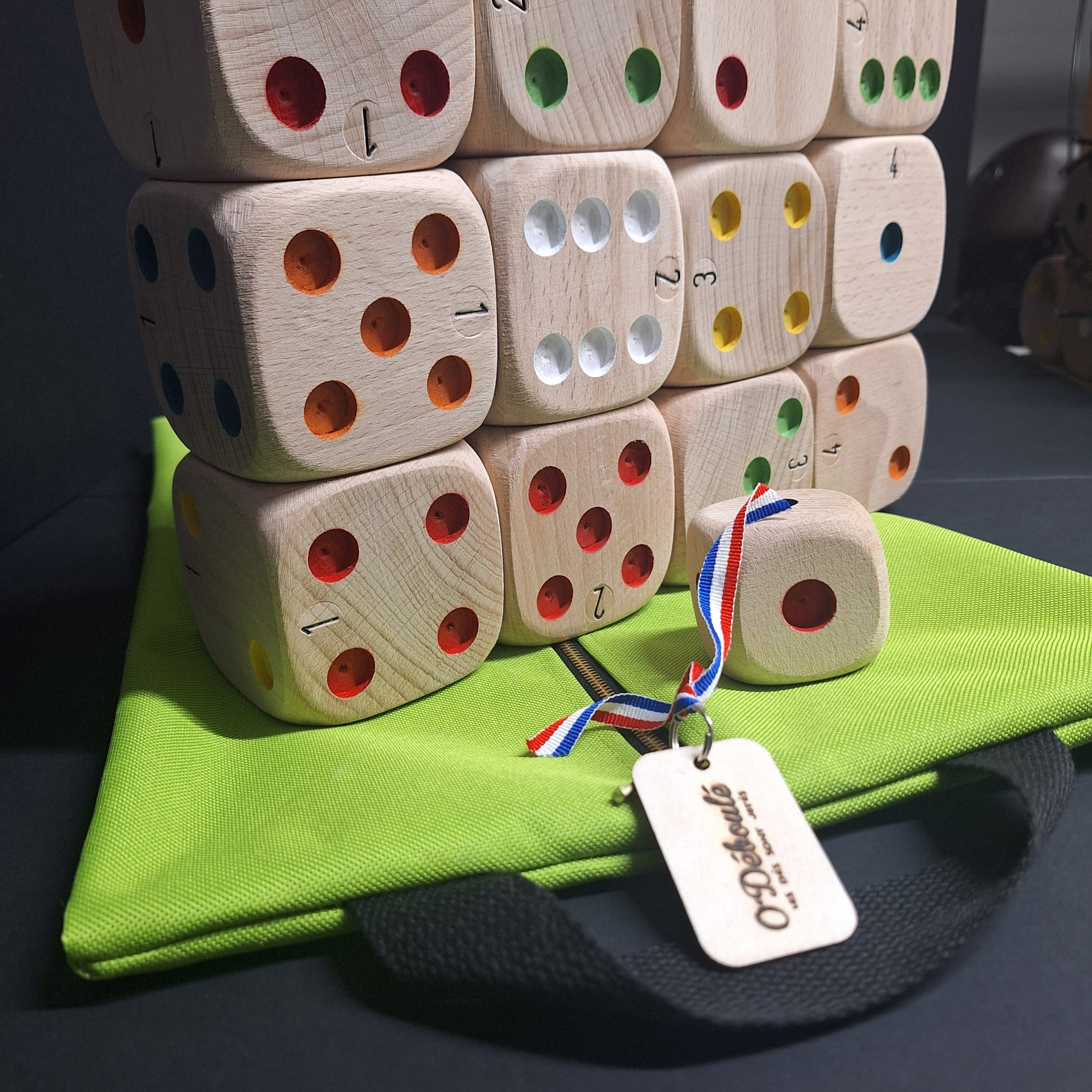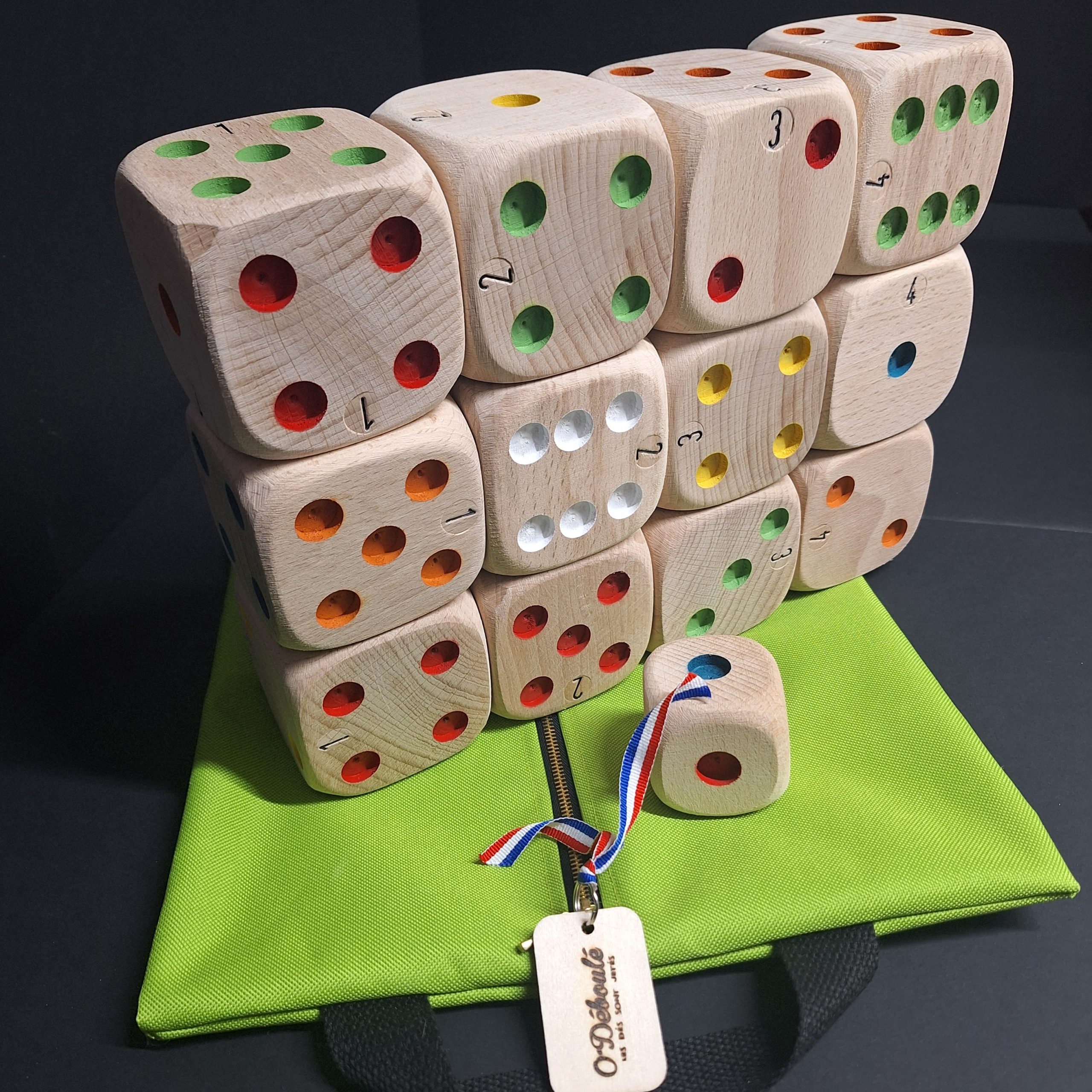 Un dé mesure 75 mm de côté (la taille d’une boule de pétanque) et pèse entre 225 et 250 g soit 3 fois moins qu’une boule de pétanque. Tous les dés sont différents.